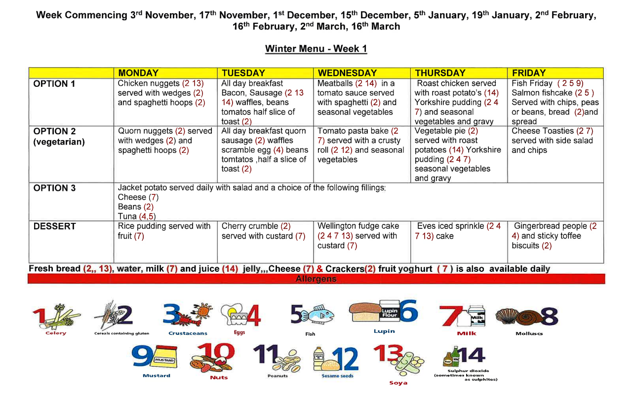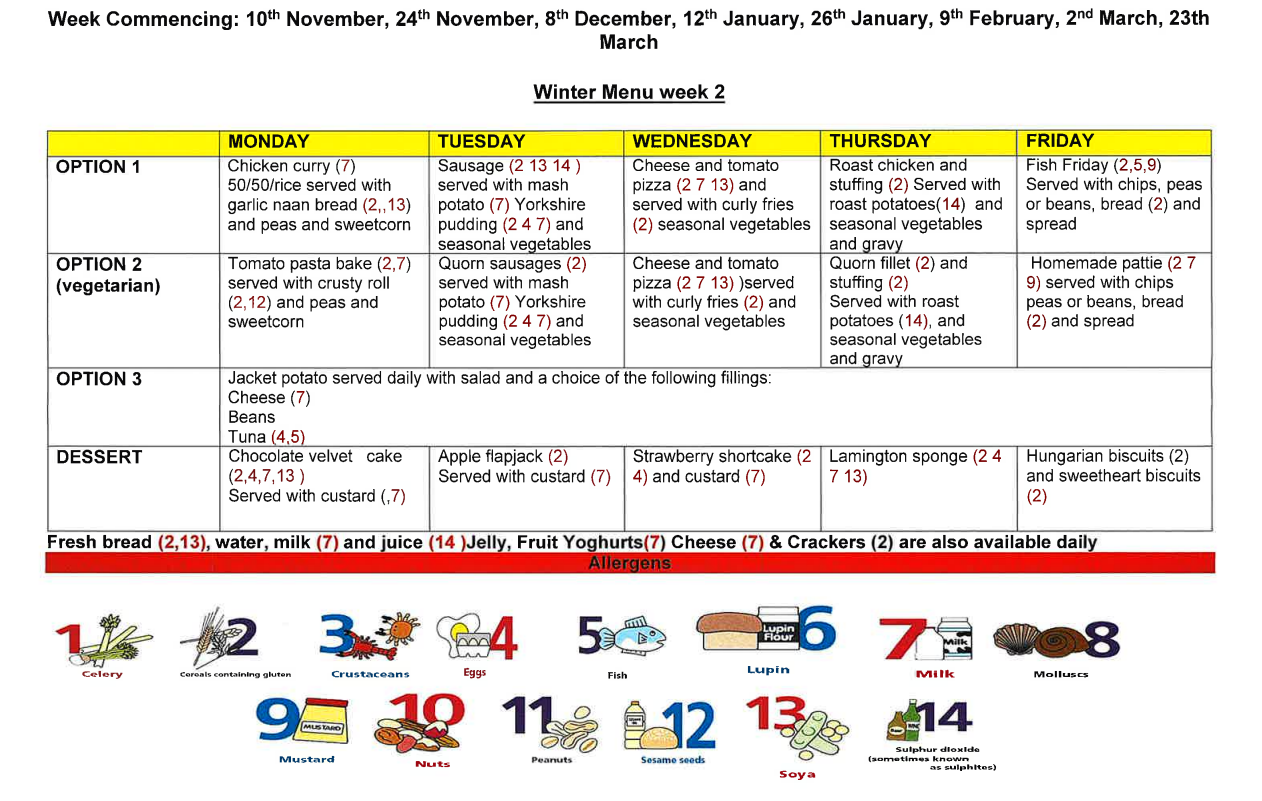 We offer school meals which follow strict nutritional standards to ensure that your child has a meal that has the correct balance of nutrients to help with their development.